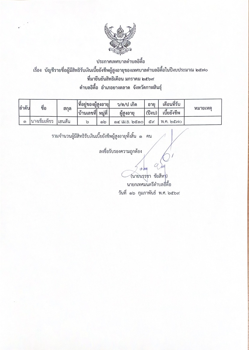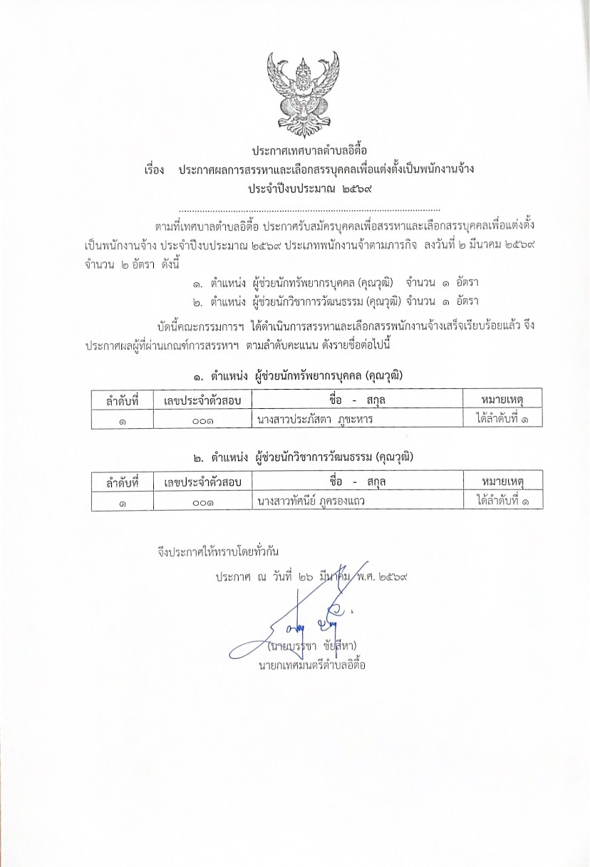 ประกาศเทศบาลตำบลอิตื้อเรื่อง ประกาศผลการสรรหาและเลือกสรรบุคคลเพื่อแต่งตั้งเป็นพนักงานจ้าง ประจำปีงบประมาณ ๒๕๖๙
